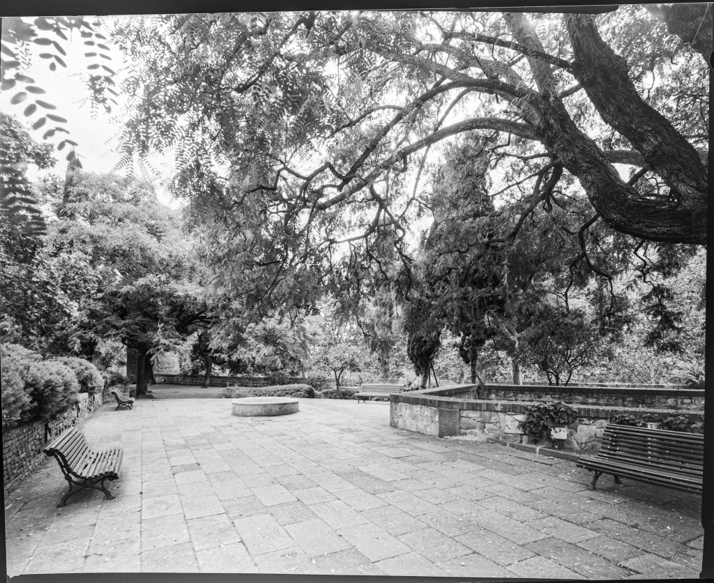 A l’entrada al recinte per l’avinguda de les Drassanes trobem el jardí del museu, amb una font al centre i diverses palmeres, a on ara hi ha la cafeteria del museu.