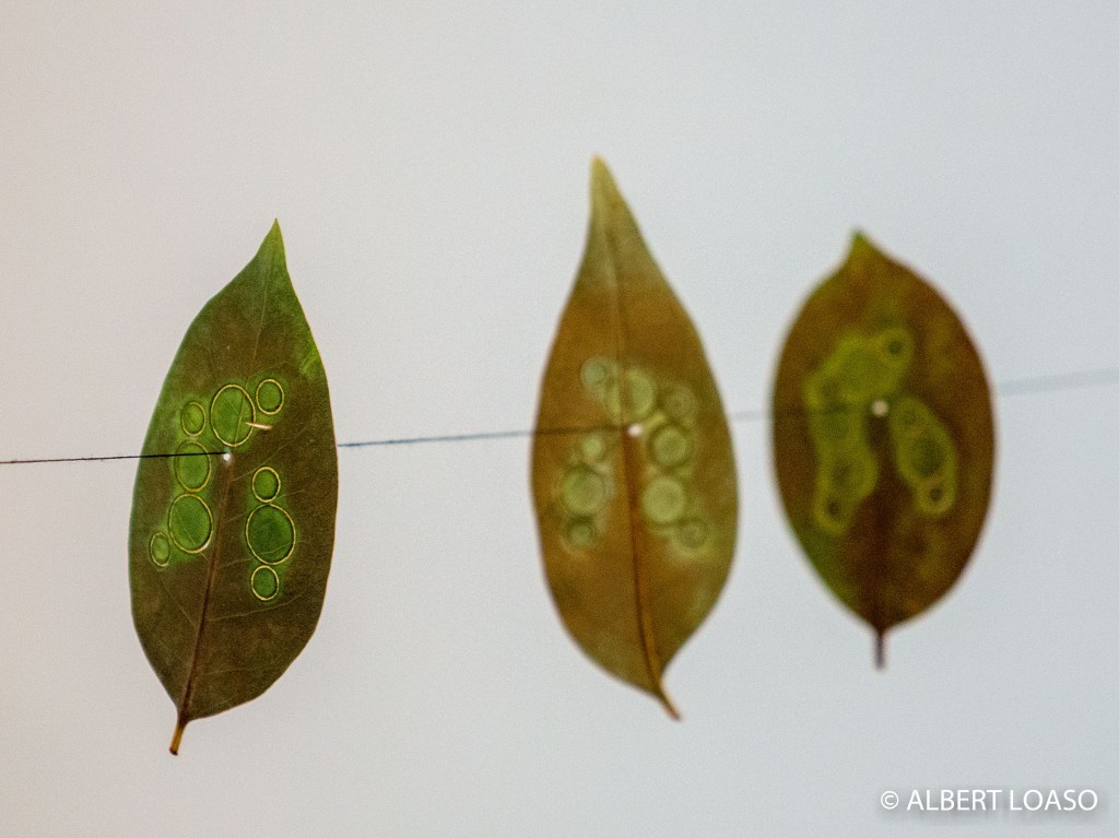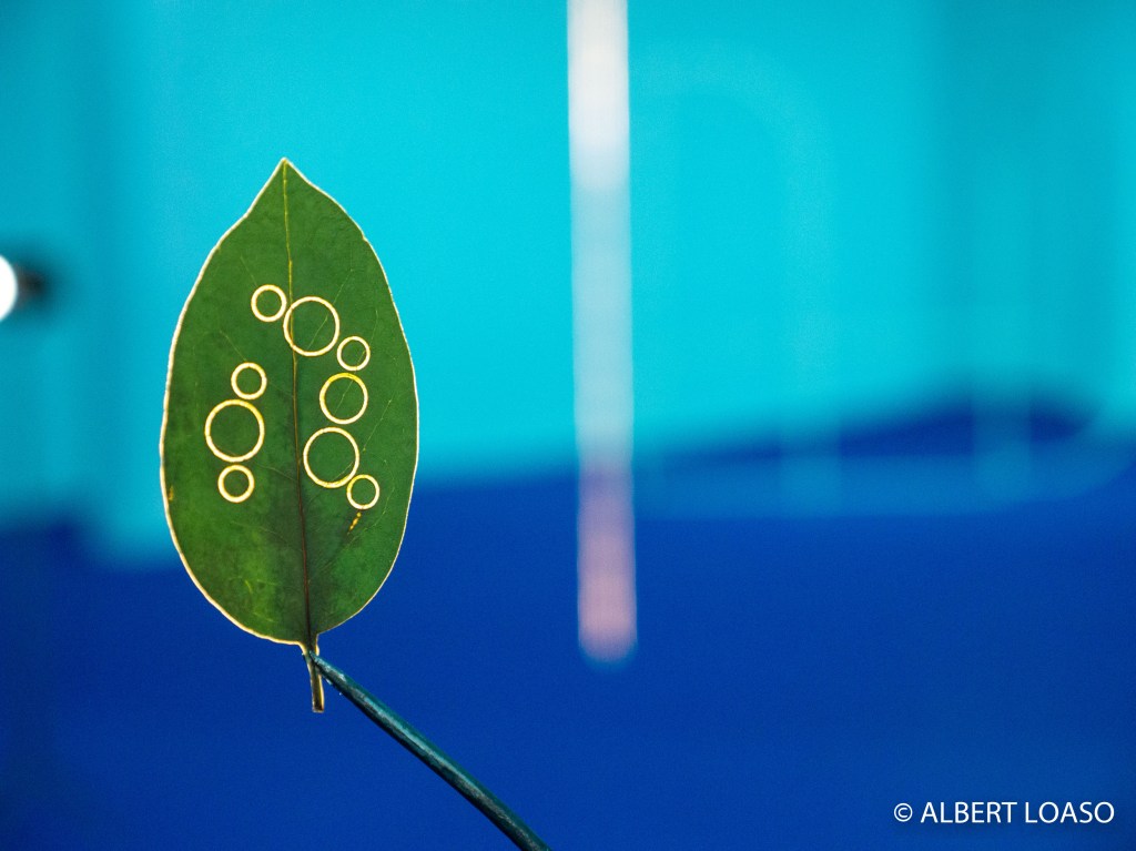 Aquesta obra concentra l’element orgànic i el geomètric en una sola fulla.; un cúmul d’incisions perfectes en forma de cercles interrompen els nervis de la fulla, deixant passar el feix de llum que surt d’un projector.