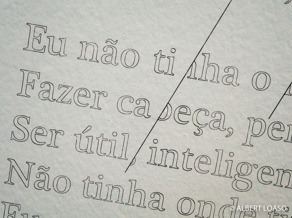 Aquest poema de Stella do Patrozinio es reparteix al llarg de la sala, a on es reflexiona sobre les limitacions físiques del cos i el desig de fusionar-se amb l’entorn. Stella do Patrozinio, diagnosticada d’esquizofrènia i que va passar les tres últimes dècades de la seva vida en un hospital psiquiàtric. Carla Gugliardi va enregistrar la veu de Stella i es va publicar el poemari per la poeta i filòsofa Viviane Mosé amb el títol Reino dos bichos e dos animais é o meu nome. Per a David Stee Mangrané és una font d’inspiració amb la seva recerca de l’estudi de l’entorn i el propi cos.