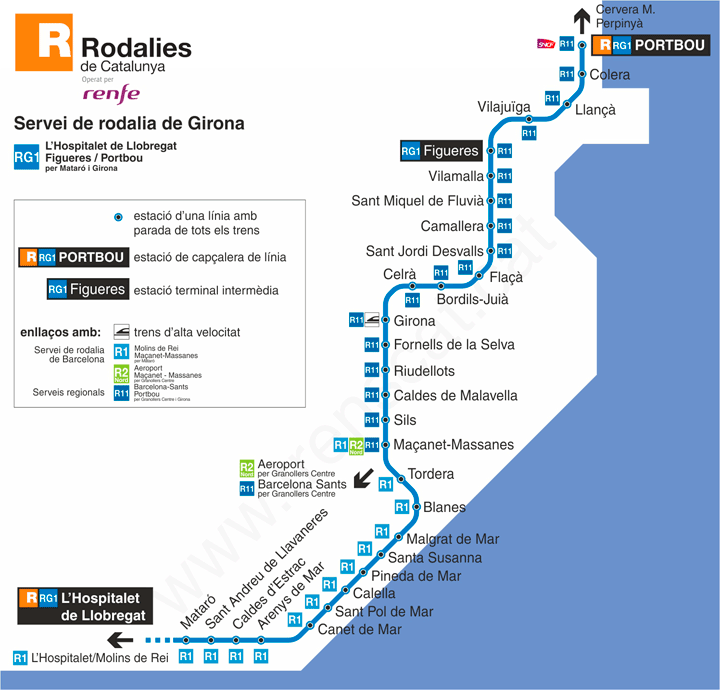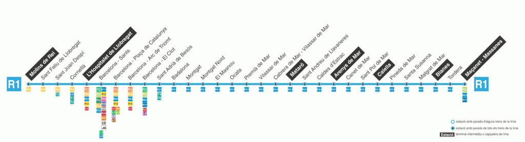 Actualment la línia la gestiona Rodalies de Catalunya R1, i fa pocs anys que s’ha ampliat el recorregut amb la RG1 fins a Figueres i Port Bou. La línia R1 ha passat de les set estacions inicials a catorze fins Mataró, hi han més d’un centenar de circulacions diàries en els dos sentits, essent la línia amb més tràfic de viatgers d’Espanya.