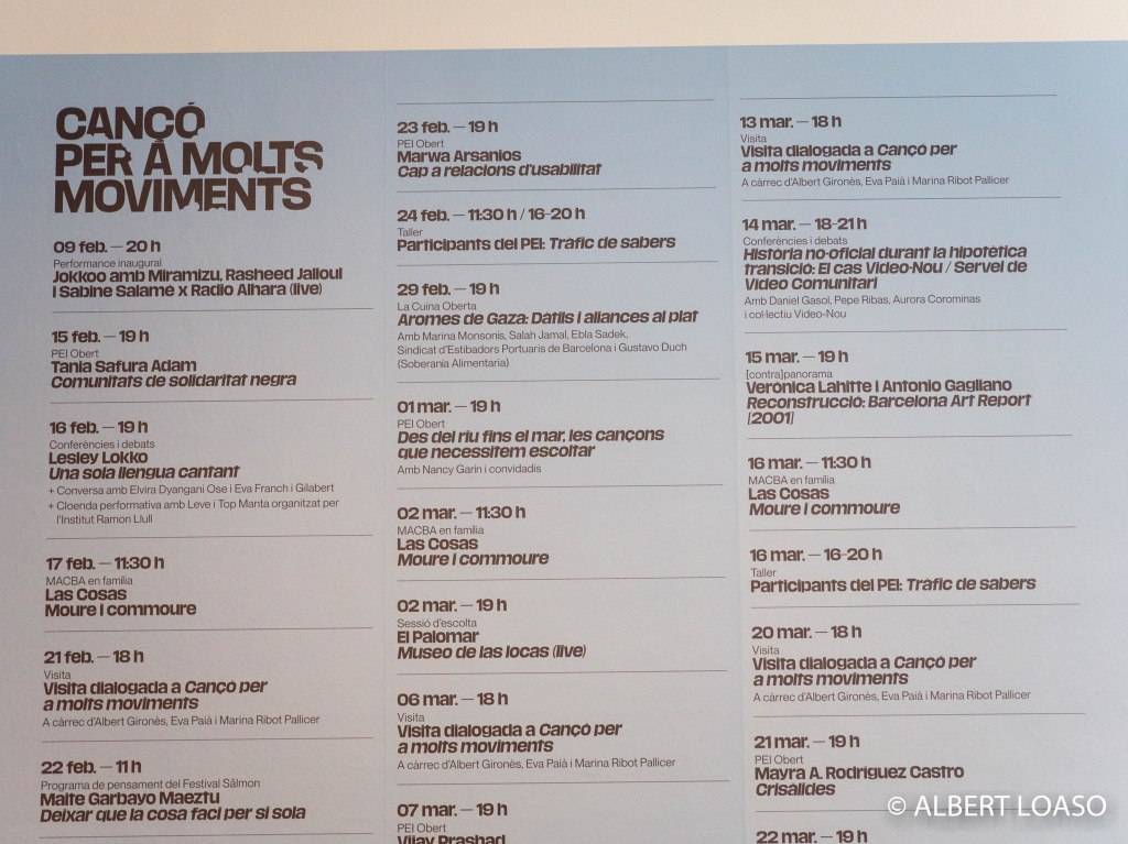Cançó per a molts moviments és un experiment efímer amb l’obertura provisional d’investigacions en curs i de les seves genealogies passades i futures dins i fora del museu. El projecte és una invitació a concebre l’espai expositiu com un espai per habitar. És un desplegament d’experiències situades, arxius encarnats i cossos de recerca des del treball tranversal del museu i els seu més enllà. Hi han preparades més de 25 activitats entre febrer i març.