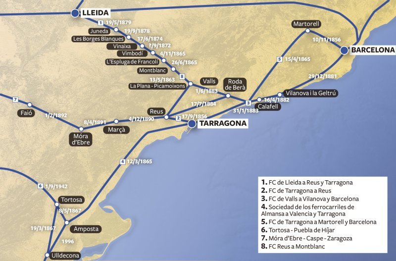 Com es pot veure en aquest mapa totes les línies de Tarragona van ser construïdes el segle XIX, excepte la variant d’Amposta a Ulldecona del 1996. Amb aquesta dada les Rodalies i connexions entre línies continuen essent del mateix traçat que fa més d’un segle.