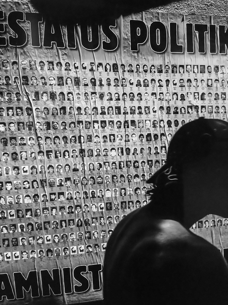 Les 49 fotografies de Bernard que es poden veure en aquest fris ens mostren les morts de tots dos bàndols, les dels cossos policials i les de terroristes i activistes; manifestacions públiques de familiars per donar suport als presos i incidents en què les forces policials despleguen la repressió en espais públics com ara universitats, així com el dolor dels uns i dels altres.