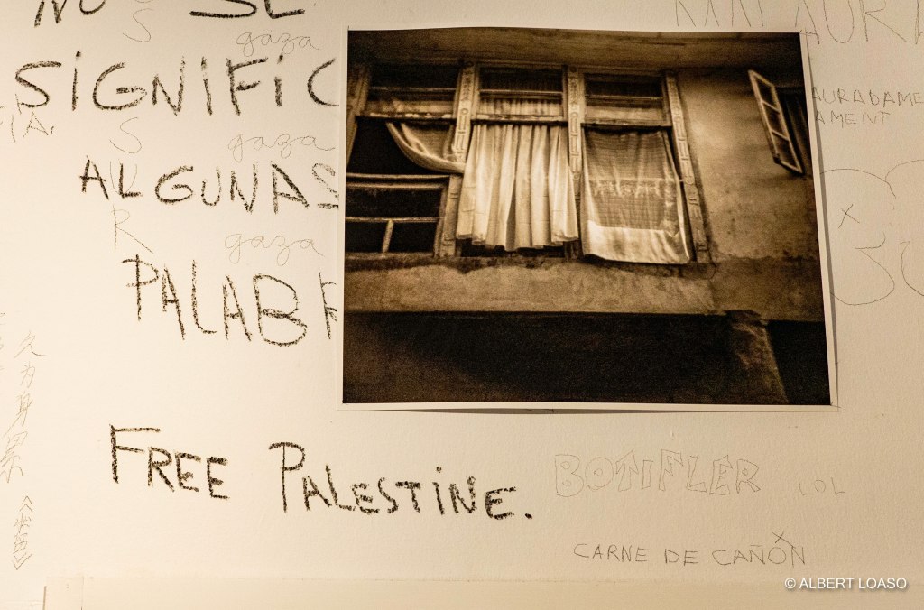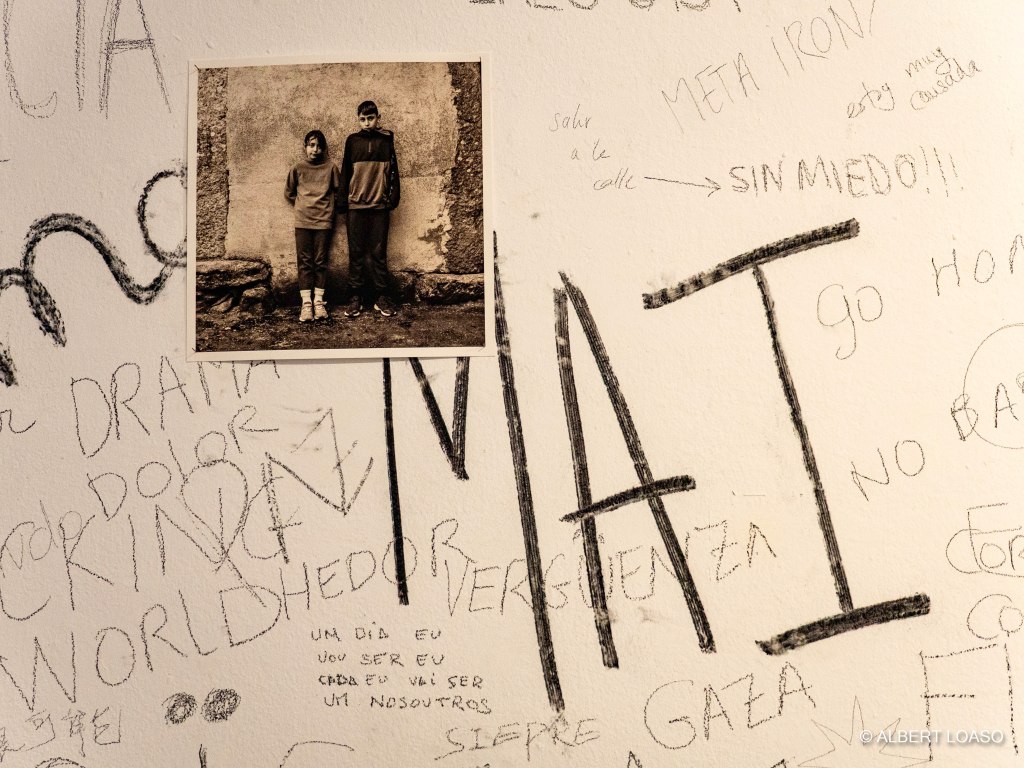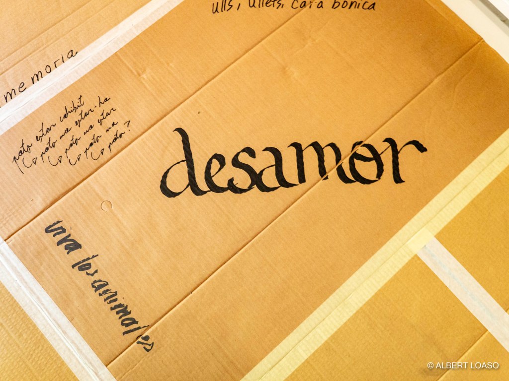 A l’espai de La Capella parets vestides amb escrits i fotrografies, i el terra s’ha forrat amb cartrons escrits amb lemes i textos poètics d’alliberament feminista, polítics i de reivindicació. És una imatge com si la sala parlés per ella mateixa.