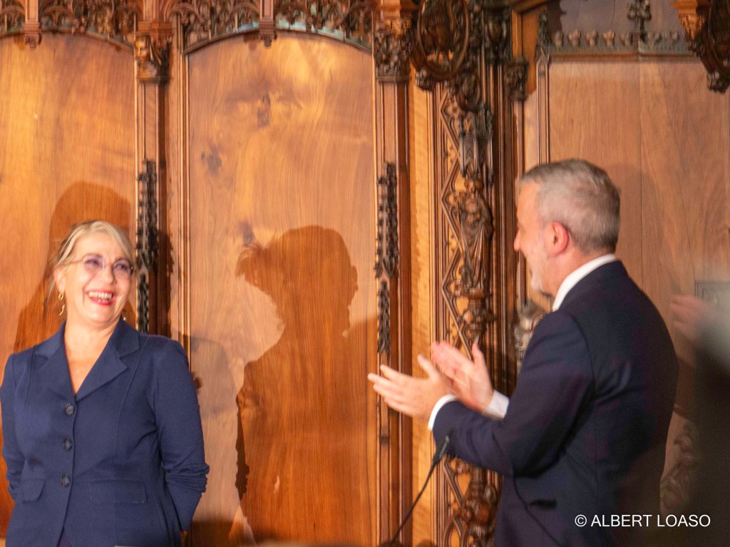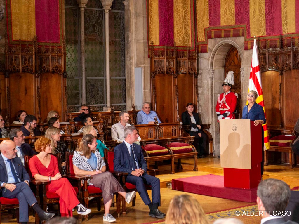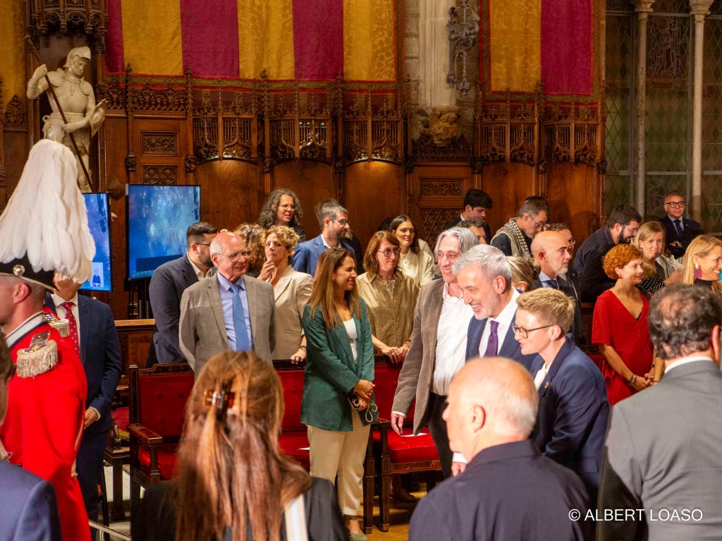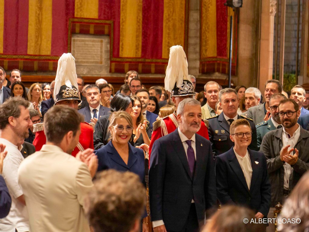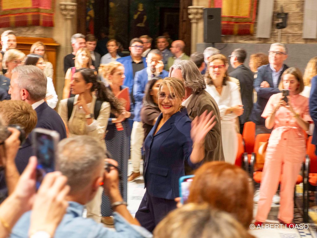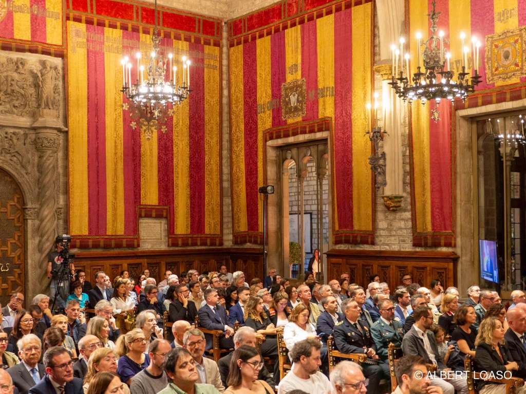 El saló de Cent de l’Ajuntament de Barcelona es va posar en peus i tot ovacionant, van entrar les tres figures d’enguany, el senyor batlle Sr. Jaume Collboni; a un costat l’alcaldessa de Manchester, la ciutat convidada a la Mercè, Ms. Beg Craig; i a l’altre costat la Sra. Emma Vilarasau, pregonera de la Mercè 2025.