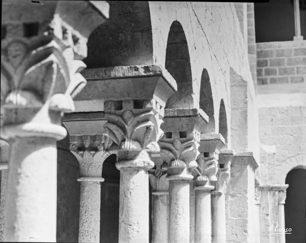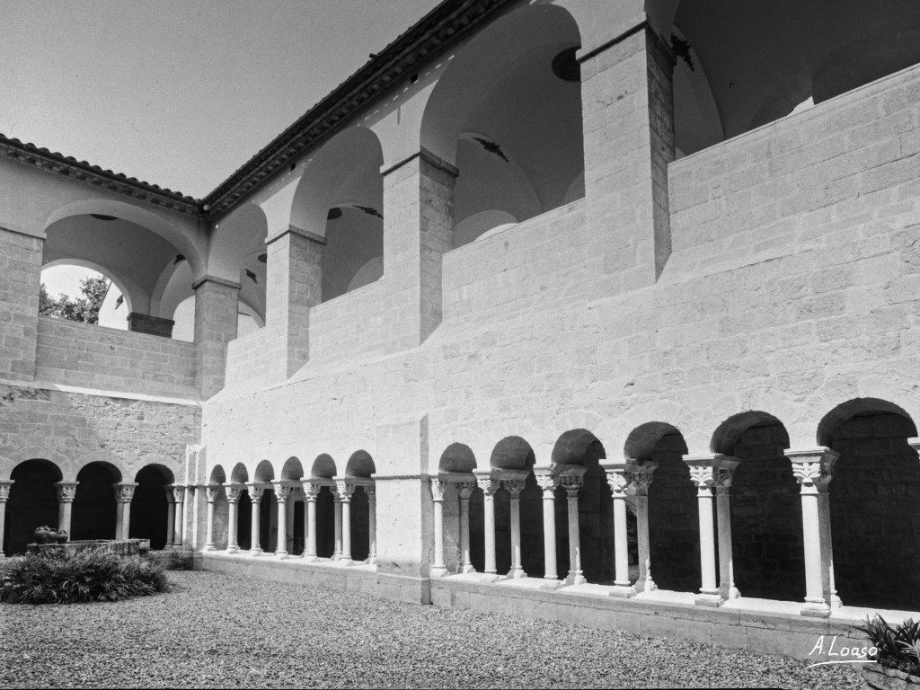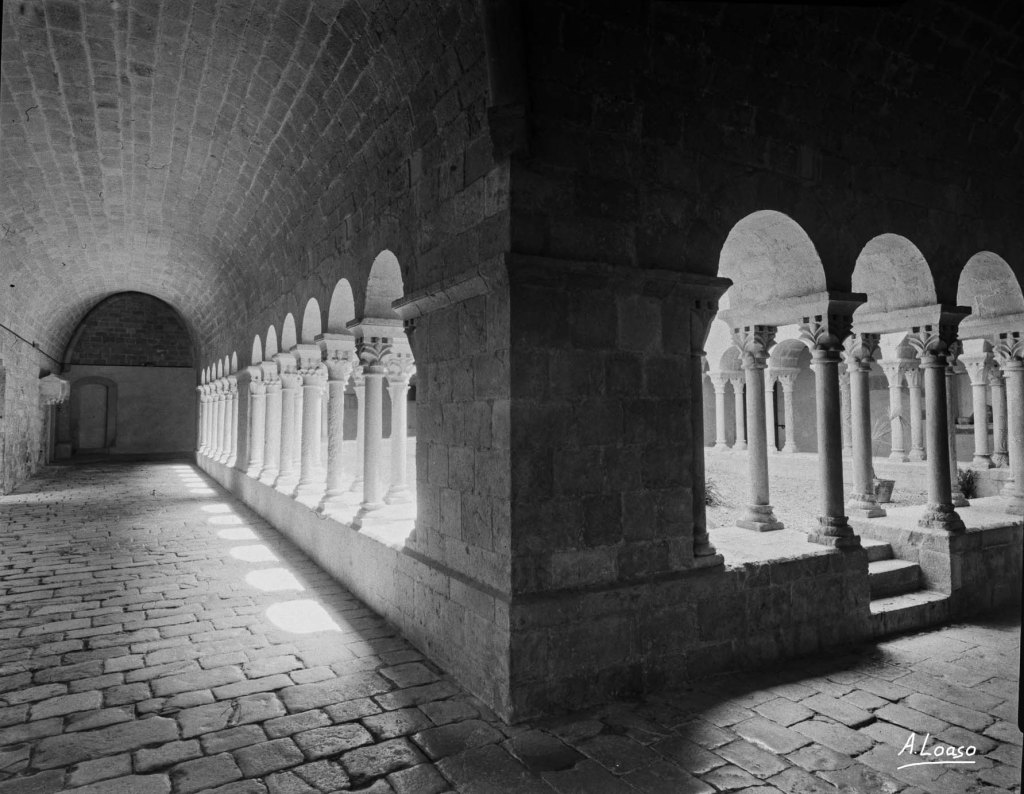 El claustre, adossat a migdia de l’església, fou bastit a la segona meitat del segle XII. De planta rectangular, és format per quatre arcades a les galeries més curtes, i sis a les altres. Els arcs de mig punt recolzen sobre parells de columnes, i al centre de cada galeria hi ha un grup de cinc columnes.