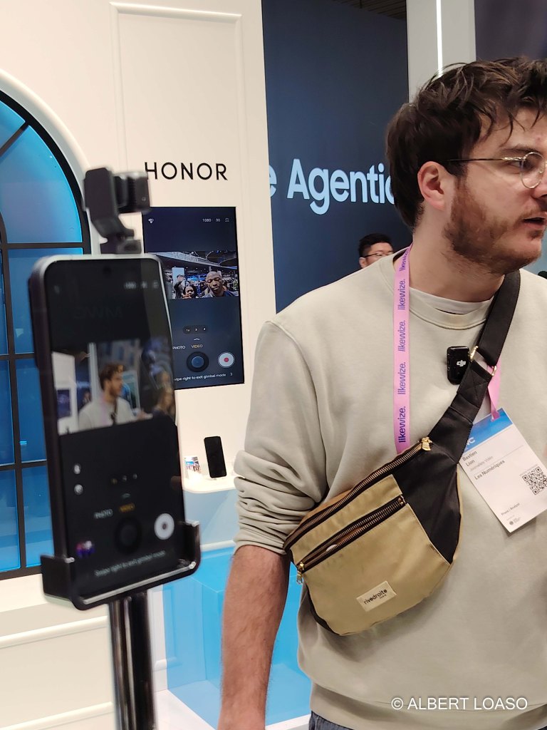 La llegada de los robots en el Mobile ha sido la novedad inesperada de esta edición. La empresa HONOR con la asociación de ARRI, una de las empresas del sector cinematográfico con más experiencia, ha conseguido incorporar un pequeño brazo articulado que en su extremo incorpora un cámara. La cámara, una vez indicado el sujeto a seguir, se pone en marcha y no deja de seguirlo pero manteniendo una horizontalidad constante, tal que fuera el dispositivo profesional llamado “Steadycam”.